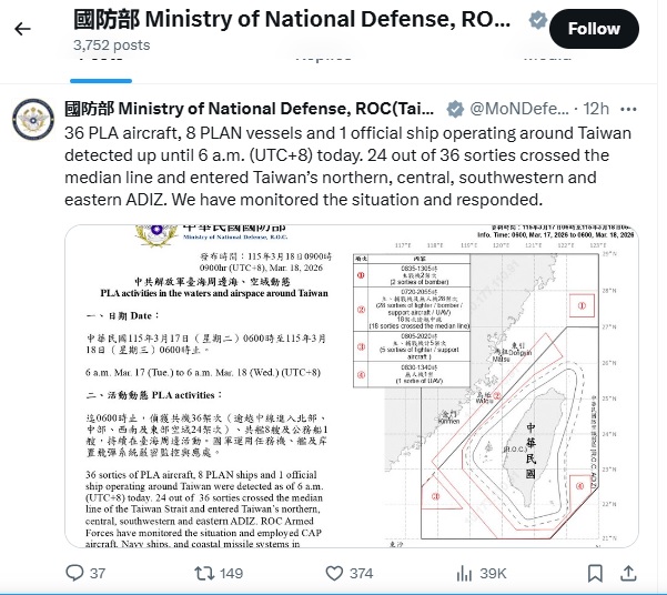 ताइवान के रक्षा मंत्रालय के अनुसार, बुधवार सुबह 36 चीनी विमान, आठ नौसैनिक जहाज़ और एक सरकारी जहाज़ ताइवान के समुद्री क्षेत्र के आस-पास देखे गए। इनमें से 24 विमानों ने ताइवान जलडमरूमध्य की मध्य रेखा को पार किया और उत्तरी, मध्य, दक्षिण-पश्चिमी तथा पूर्वी एडीआईजेड में प्रवेश किया। मंत्रालय ने कहा कि ताइवान की सशस्त्र सेनाओं ने स्थिति पर नजर रखते हुए उचित कार्रवाई की। इससे पहले मंगलवार को 28 चीनी सैन्य विमानों की गतिविधियों का पता चला था, जिनमें से 21 ने मध्य रेखा को पार किया था।