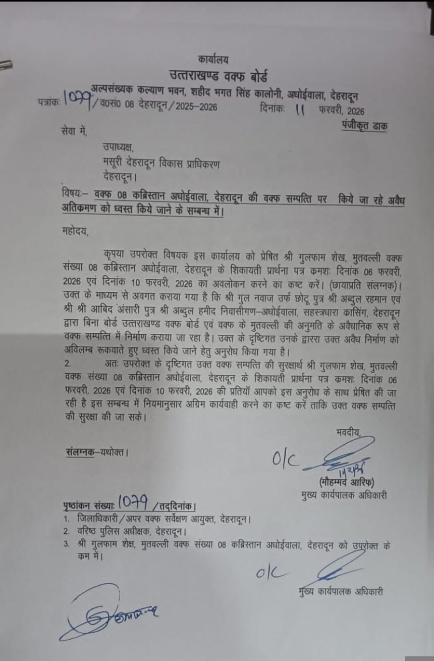मामले की गंभीरता को देखते हुए पत्र की प्रतिलिपि जिलाधिकारी, अपर वक्फ सर्वेक्षण आयुक्त, वरिष्ठ पुलिस अधीक्षक देहरादून और संबंधित मुतवल्ली को भी भेजी गई है, ताकि वक्फ संपत्ति की सुरक्षा सुनिश्चित की जा सके।