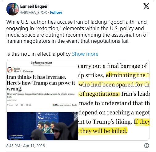 तेहरान, 11 अप्रैल (हि.स.)। ईरान ने अमेरिकी मीडिया पर दोहरा रवैया अपनाने का आरोप लगाया है। ईरान के विदेश मंत्रालय के प्रवक्ता इस्माइल बघाई ने कहा कि एक ओर अमेरिका ईरान पर ईमानदारी की कमी का आरोप लगाता है, दूसरी ओर कुछ अमेरिकी मंचों पर ईरानी प्रतिनिधियों के खिलाफ हिंसक बयान सामने आ रहे हैं।
