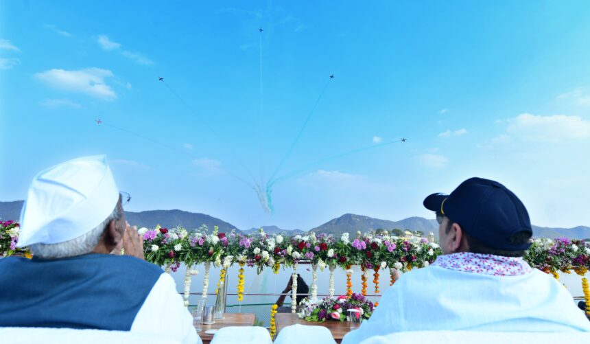 जल महल पर खुले आसमान में सारंग हेलिकॉप्टर डिस्प्ले टीम ने सटीकता और सामूहिक समन्वय का अद्भुत प्रदर्शन किया। टीम ने सारंग स्पिलिट, एरोहैड, डॉल्फिन लीप, लेवल क्रॉस, हाई स्पीड क्रॉस, क्रॉस ओवर ब्रेक, डायमंड एवं इन्वर्टेड वाइन ग्लास जैसी अनेक आकृतियां आसमान में बनाई। सूर्य किरण एरोबैटिक टीम ने इन्वर्टेड रन, बैरल रोल, बॉम्ब बर्स्ट, डीएनए संरचना जैसी अनेक आकृतियां के साथ आसमान में दिल बनाकर वायु सेना की ओर से जयपुरवासियों का अभिनंदन किया। इस दौरान दोनों टीमों द्वारा कॉकपिट से ‘‘खम्मा घणी‘‘ और ‘‘राम-राम सा‘‘ का उद्घोष जनता के लिए आकर्षण का केंद्र रहा।