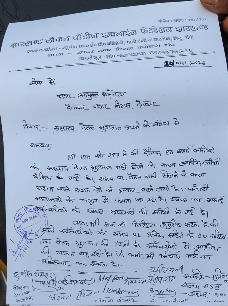 संजय मंडल ने नगर आयुक्त से मांग की है कि सभी कर्मचारियों का वेतन प्रत्येक माह की 10 तारीख तक सुनिश्चित रूप से भुगतान किया जाए,ताकि उन्हें आर्थिक परेशानियों से राहत मिल सके। इधर,नगर निगम चुनाव के बाद भी बाबा नगरी देवघर में साफ-सफाई की व्यवस्था संतोषजनक नहीं है। इसका असर न केवल शहर की छवि पर पड़ रहा है,बल्कि देवघर नगर निगम की कार्यप्रणाली पर भी सवाल खड़े हो रहे हैं। इस ज्ञापन पर सुनील राम,लखन हरिजन,शंकर राम,प्रदीप राम,चंदन कुमार, अजय राम समेत कई कर्मचारियों ने हस्ताक्षर किए हैं।—————