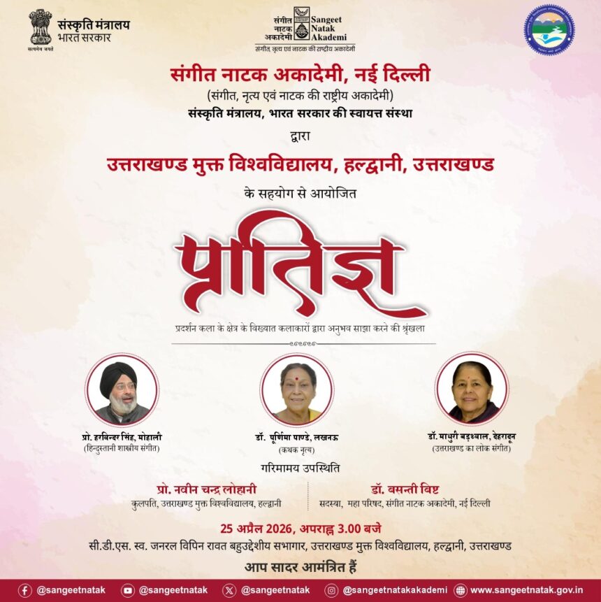 हल्द्वानी , 21 अप्रैल (हि.स.)। संगीत, राष्ट्रीय नृत्य एवं नाटक अकादमी, नई दिल्ली (संगीत नाटक अकादमी), संस्कृति मंत्रालय, भारत सरकार की स्वायत्त संस्था द्वारा उत्तराखण्ड मुक्त विश्वविद्यालय, हल्द्वानी के सहयोग से “प्रातिज्ञ” कार्यक्रम का आयोजन किया जा रहा है। यह कार्यक्रम 25 अप्रैल 2026 को अपराह्न 3:00 बजे से विश्वविद्यालय परिसर स्थित सी.डी.एस. स्व. जनरल बिपिन रावत बहुद्देशीय सभागार में आयोजित होगा।