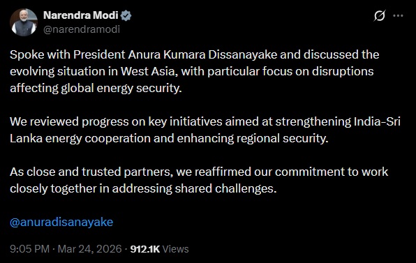 नई दिल्ली, 24 मार्च (हि.स.)। पश्चिम एशिया में बढ़ते तनाव के बीच प्रधानमंत्री नरेन्द्र मोदी और श्रीलंका के राष्ट्रपति अनुरा कुमारा दिसानायके के बीच फोन पर अहम बातचीत हुई। इस दौरान दोनों नेताओं ने वैश्विक ऊर्जा सुरक्षा और क्षेत्रीय हालात पर विस्तार से चर्चा की।