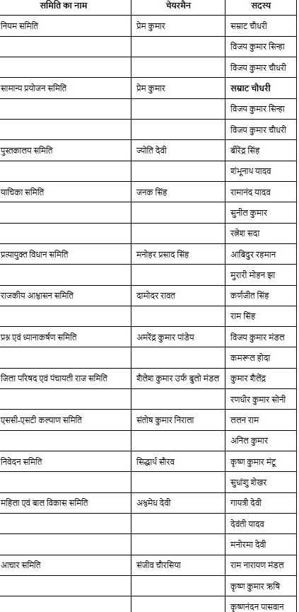 विधानसभा की नियम समिति के अध्यक्ष स्वयं विधानसभा अध्यक्ष प्रेम कुमार होंगे। इस समिति में उपमुख्यमंत्री सम्राट चौधरी, विजय कुमार सिन्हा और संसदीय कार्य मंत्री विजय कुमार चौधरी को सदस्य बनाया गया है।