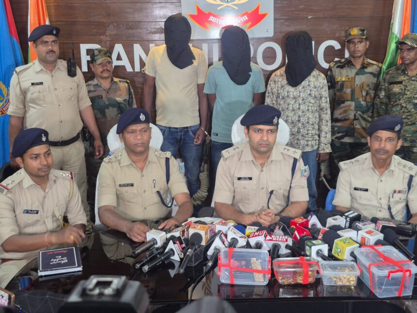 रांची, 08 अप्रैल (हि.स.)। रांची के बरियातू थाना क्षेत्र स्थित प्रीति ज्वेलर्स में हथियार के बल पर लूटकांड का रांची पुलिस ने 10 घंटे के भीतर खुलासा करते हुए तीन अपराधियों को गिरफ्तार किया है। साथ ही लूटी हुई चांदी भी बरामद की है। गिरफ्तार अपराधियों में आशुतोष कुमार, महेश वर्मा और सिराज अंसारी शामिल हैं। इनके पास से दो बाइक, पांच मोबाईल, लूट का चांदी, एक पिस्टल, दो मैग्जीन और चार गोली बरामद किया गया है।