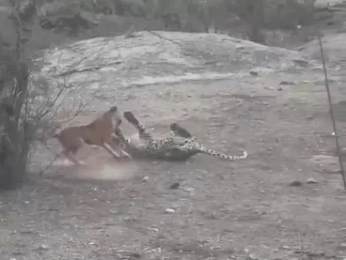 हिल रेस्ट एरिया में सुबह मादा लेपर्ड ने एक बकरे का शिकार किया था। शाम को जब वह अपने शिकार को लेने वापस लौटी, तब वहां तीन कुत्ते मौजूद थे। जैसे ही लेपर्ड ने मौका देखा, उसने झपट्टा मारकर एक कुत्ते को दबोच लिया। कुछ देर तक दोनों के बीच जोरदार संघर्ष चला। लेपर्ड कुत्ते को मुंह से पकड़कर घसीट रही थी, लेकिन तभी कुत्ते ने पलटवार करते हुए लेपर्ड को जमीन पर गिरा दिया। अचानक हुए इस पलटवार से घबराकर लेपर्ड ने शिकार छोड़ दिया और तेजी से जंगल की ओर भाग निकली।