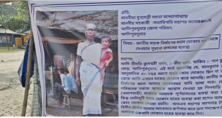 उन्होंने मोड़ पर चार बड़े फ्लेक्स भी लगाए है, जिनमें उनकी पुरानी और वर्तमान दुकान की तस्वीरों के साथ पुनर्वास की मांग लिखी गई है। उनका कहना है, मुझे भी पलाशबाड़ी में पुनर्वास दिया जाए। अभी सड़क किनारे छाता लगाकर किसी तरह दुकान चला रही हूं। अगर हटने को कहा गया तो यह सहारा भी छिन जाएगा।