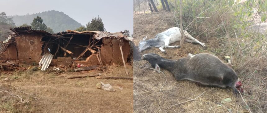 जानकारी के अनुसार वन परिक्षेत्र अनूपपुर के ग्राम पंचायत खांड़ा में जंगल के किनारे खेत में बने कच्चे घर में बलराम केवट के खांड़ा में तीन हाथियों का समूह जो तीन दिनों से इस क्षेत्र में विचरण कर रहे हैं के घर में बंधी गाय एवं बैल पर हाथियो ने हमला कर मार दिए, वहीं इस भय से बाकी मवेशी रस्सी तोड़कर जंगल की ओर भाग गए। इसके बाद कच्चे घर को तोड़फोड़ कर तहस-नहस करते हुए खेतों में लगी फसलों को भी नुकसान पहुंचा। घटना की जानकारी पर वन विभाग के कर्मचारियों के साथ पशु मौके पर पहुंचकर घटना स्थल का निरीक्षण किया।
