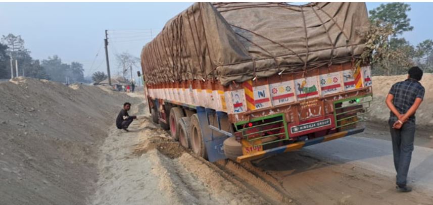 जानकारी के अनुसार, ट्रक गुवाहाटी से सामान लेकर आंध्र प्रदेश की ओर जा रहा था। चालक याम सोलबाम ने बताया कि मदारीहाट एशियन हाईवे की ओर जाने के बजाय वह गलती से फालाकाटा की तरफ आ गया। रात करीब तीन बजे बालुरघाट इलाके के पास सामने से आ रहे वाहन को साइड देने के दौरान सड़क किनारे डाली गई ढीली मिट्टी में ट्रक का पहिया धंस गया। वहां सड़क किनारे डंपरों से मिट्टी डालने का काम चल रहा था, जिससे सड़क बेहद संकरी हो गई थी।
